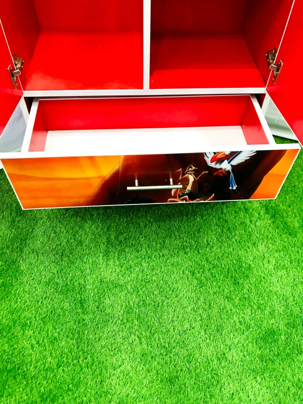 *This vinyl sticker is pasted on the cupboard which is shaped like cartoon .
